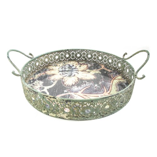 Bandeja de ferro vazado com espelho estampado com alças, conferindo um toque informal a peça, além de útil é bastante decorativo