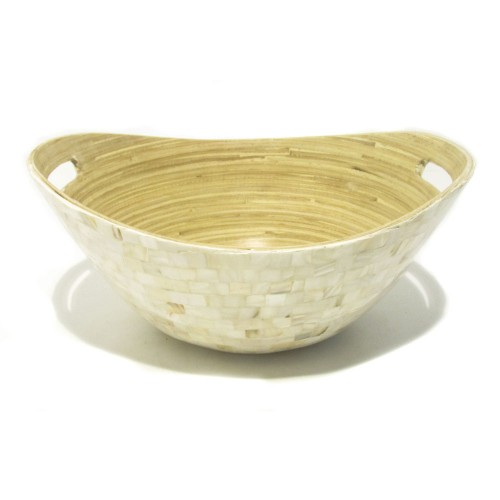 Bowl com alças de Bamboo decorado com  capiz de Madrepérola, muito usado para flores e frutas. É uma peça bastante original, ótima para presentear e decorar.