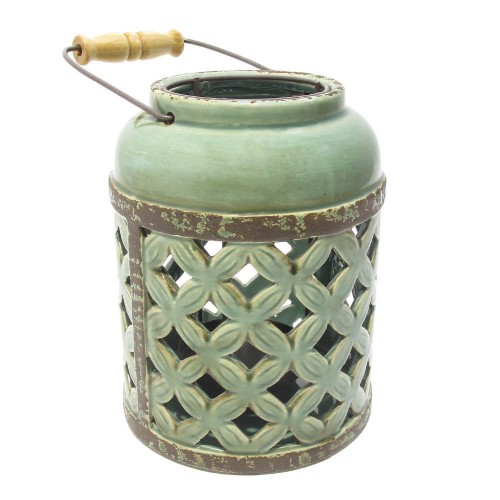 Lanterna de cerâmica esmaltada com alças de ferro e madeira. Usada com velas, vai deixar seu espaço mais acolhedor.